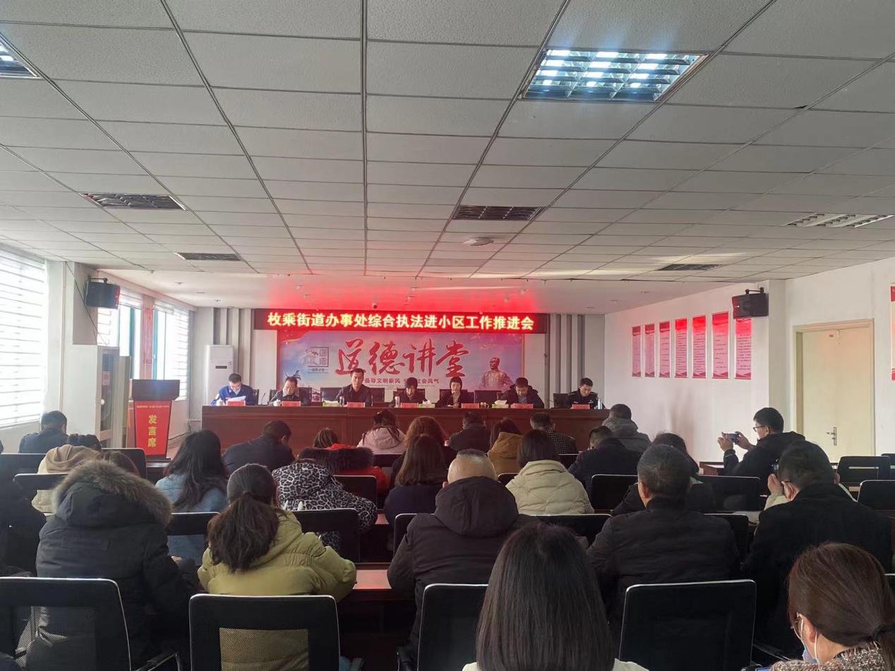 会上,枚乘街道副主任陈都具体部署了街道综合执法进小区工作,区综合行政执法局、区住建局物管处、区消防大队相关负责人分别解读了本单位综合执法进小区工作职能。枚乘街道党工委副书记、主任王悦提出要求:一是围绕“一个目标”,提高思想认识,要以民为本,把综合执法进小区作为惠民、利民、服务群众的民心工程;二是遵循“三个原则”,保障工作推进,要遵循依法管理、分类管理、部门协作原则,边探索、边完善、边提升;三是做到“四个到位”,提升成果实效,做到组织领导到位、宣传发动到位、任务分解到位、问题解决到位,把工作做实做细。